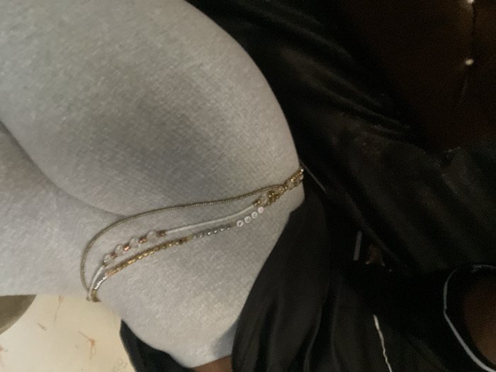 The image displays a close-up of an individual's upper thigh and hip area, positioned in Ajaokuta, Nigeria. The subject wears light grey, form-fitting legwear, possibly leggings. Multiple strands of waist beads encircle the upper thigh/hip, composed of small beads in gold, white, and translucent pinkish colors. A dark fabric, likely a garment, is visible on the upper left side, partially obscuring the torso. To the left of the leg, a dark, reflective surface, consistent with upholstered furniture, is present. The background is out of focus, showing soft, light-toned elements indicative of an indoor environment.