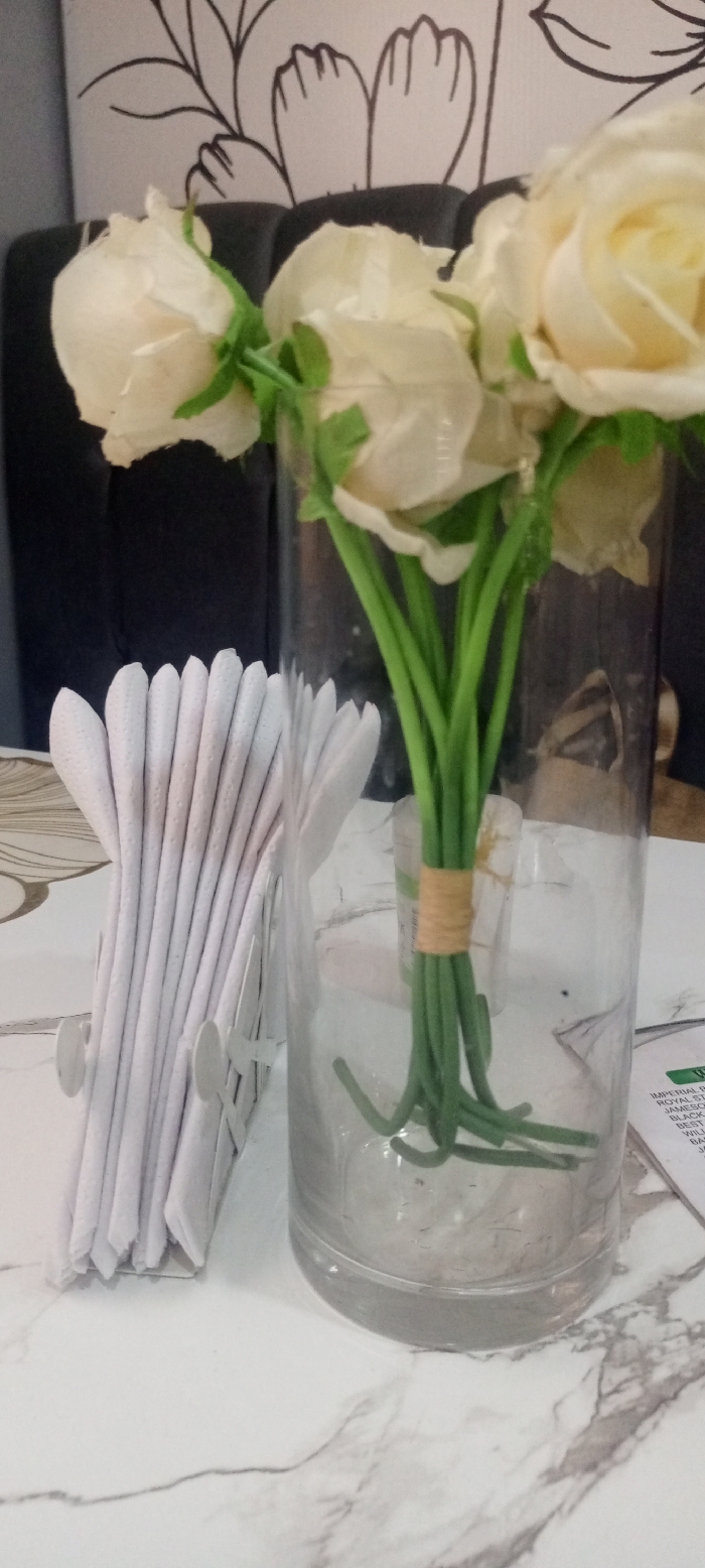 A clear vase filled with faux white roses and faux green stems sits on a marble surface. The stems are bound together with brown twine. Next to the vase is a white napkin holder containing neatly stacked white napkins. In the background, there's a dark chair and a white wall with a black floral pattern. The surface is white with gray marbling. A paper with text is partially visible at the edge of the surface.