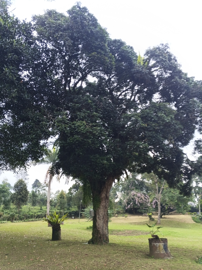This image depicts an outdoor landscape in Lokossa, Benin, characterized by dense vegetation under an overcast sky. A large, mature tree with a thick, textured, dark brown trunk and a dense canopy of dark green leaves dominates the central and upper portions of the frame. Vines or epiphytes are visible growing on its trunk and lower branches, with a few lighter green fronds protruding from its upper canopy. In the foreground, to the left of the main tree, a cylindrical, weathered dark gray planter containing a fern-like plant with broad green leaves sits on a grassy patch. To the right of the main tree, another shorter, wider cylindrical planter, showing discoloration or paint, holds a small plant with several green leaves. The ground consists of a mowed grassy area, exhibiting variations in green and light brown tones, with scattered debris. In the midground and background, an array of trees and shrubs forms a dense line. A tall, slender tree with a light-colored trunk is visible behind the left planter. Further back on the right, a tree with visible light pink or purple blossoms is present. No individuals or discernible animal life are observed.