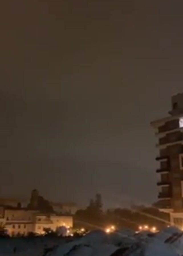night-time view of a town or city. The sky is dark and overcast. In the foreground is a pile of dark material, possibly rubble or earth. Beyond this is a low-rise urban landscape with buildings of various heights and designs, lit by streetlights and lights from within the structures. In the middle ground to the right is a modern, taller building with multiple levels, some of which have illuminated windows. The overall scene is dimly lit and presents a slightly grainy quality, likely due to low-light conditions.