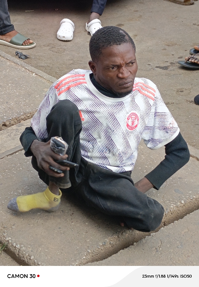 A man in a Manchester United jersey and black pants sits on a concrete curb. He holds a phone wrapped in plastic in his left hand. He wears a yellow sock on one foot, and his face is serious. Other people stand nearby, wearing sandals and white Crocs. The scene appears to be on a street with concrete pavement.
