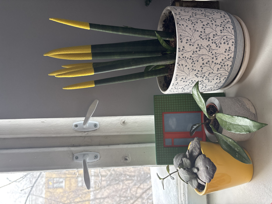 The image captures an indoor windowsill scene, overlooking a cold exterior. The specific location within Moscow, Russia, cannot be determined from the visual evidence. On the left, a white-painted wooden window frame is visible, consisting of two vertical sashes, each secured by a white metal handle. Through the clear windowpanes, a blurred exterior shows a light-colored building, likely residential, partially obscured by bare trees. The ground surface outside appears covered in snow or frost under an overcast sky. Arranged on the light-colored windowsill are three potted plants and a decorative item. On the right, a large Sansevieria plant, specifically *Sansevieria cylindrica* or similar, is potted in a light-colored ceramic pot adorned with a repeating pattern of dark grey stylized branches and berries, resting on a plain white saucer. This plant features multiple dark green, cylindrical stems, each with an artificially applied bright yellow, conical tip. To the left of this, a smaller plant with dark, slightly textured leaves is housed in a bright yellow, conical ceramic pot, with several small grey stones visible on the soil surface. Further to the left, a third plant with two prominent, glossy green, variegated leaves grows in a small, textured light grey cylindrical pot. Positioned behind the two smaller plants, a square, green object with a grid pattern, resembling a picture frame, contains a red rectangular design depicting a window-like structure with a light blue interior. The interior wall to the right of the window is a plain light grey. No individuals are present in the scene.
