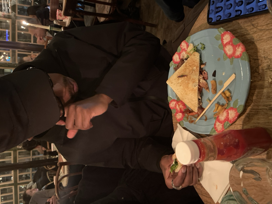 A person wearing a dark jacket and hat sits at a table with a plate of food, a bottle of ketchup, and a glass. The plate holds a half-eaten sandwich, some fries, and a toothpick. The bottle of ketchup is tilted towards a smaller sandwich in the person's hand. The table appears to be in a restaurant setting with other people in the background, as well as a phone laying on the table.
