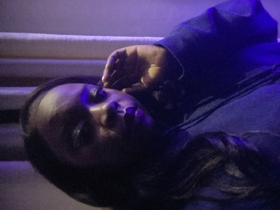A person lies sideways with their head resting on a surface. The individual, wearing a dark blue hooded sweatshirt, gazes upwards with their hand near their face. The lighting is dark and illuminated with a blue hue. The background features what seems to be a plush or soft, light-colored surface. The person has dark hair, parted to the side, with a section styled in a curl near the shoulder.