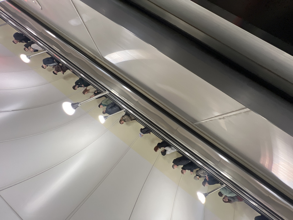 - "A long, upward-moving escalator is depicted within the Shushary Metro Station, Shushary, Russia" by FM-4Mf512, licensed under CC BY 4.0