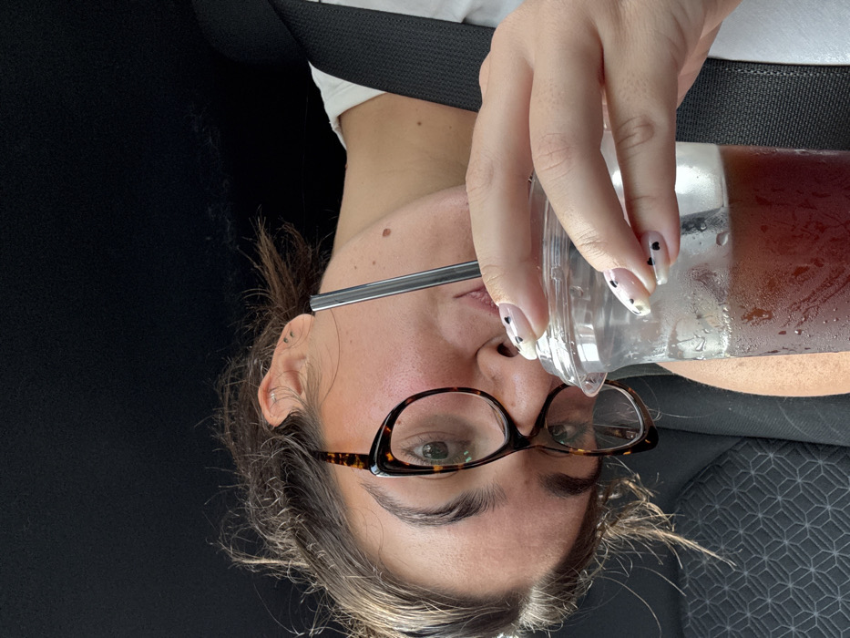 A person wearing tortoise shell glasses is holding a plastic cup filled with iced tea. They have manicured nails with small black hearts. A metal straw is positioned towards their mouth. The person is wearing a white shirt and a black seatbelt. The background includes a black car interior and a car seat with a patterned fabric. The photograph is taken from a close-up angle, with the person's face and the drink prominently featured.