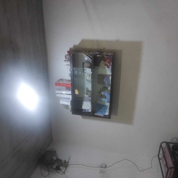 The image depicts an indoor room, likely a functional space within a residence or office in Jos, Nigeria. No specific details within the image allow for pinpointing a precise location within the city. The room features light-colored, plain walls and a dark-colored, possibly paneled, ceiling. A bright, rectangular LED panel light is centrally mounted on the ceiling, serving as the primary light source and casting defined shadows on the wall. In the upper-left quadrant, a cluster of disorganized electrical wiring and cables is attached to the wall, with wires extending downwards to two light-colored electrical outlets or switches. In the lower-left corner, the upper portion of a portable gasoline generator is visible, characterized by a red fuel tank and a black metal frame. A black cable extends from the wall-mounted electrical components towards the generator. A dark-colored, wall-mounted display cabinet or bookshelf is positioned on the right side of the image. This cabinet has two tiers; the upper tier features glass doors and contains various items, including multiple books with prominent white and red spines, and several mugs or small containers. A small, yellow, smiley-face-shaped ornament is affixed to the glass of the upper tier. The lower tier is open and holds several books or brochures, some displaying photographic portraits on their covers. No individuals are present, and no actions or interactions are depicted.