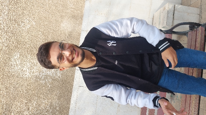 A young man sits on a bench outdoors, smiling at the camera. He wears round glasses, a black t-shirt, blue jeans, and a black and white varsity jacket with a "NY" logo. The background includes a textured wall and parts of the bench's metal frame. The photo is taken at an angle, with the man appearing sideways. He holds something in his hand.