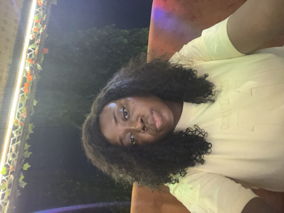 A person with dark skin and curly black hair poses in a yellow shirt with "Cowboys" subtly imprinted. They have a nose ring and are looking towards the camera. The background appears to be outdoors at night, with some greenery and a decorative light feature with flowers visible in the upper left corner. A reddish-brown surface is partially visible in the right side of the frame.