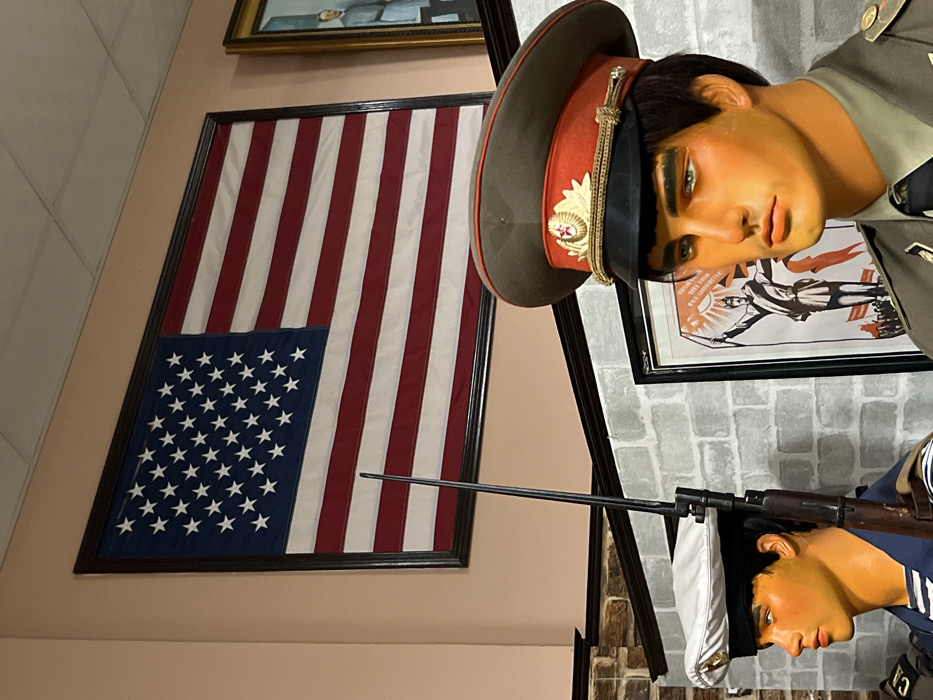 framed American flag hanging on a pink wall, next to a wall with brick-like tiles. In front of this, there are two mannequins dressed in military uniforms. The upper mannequin wears a Russian military hat, while the lower one is in a navy uniform with a white hat. A rifle is between the two mannequins. A framed poster featuring a figure with a raised sword and sun in the background is visible behind the upper mannequin. Another framed picture hangs above the American flag.