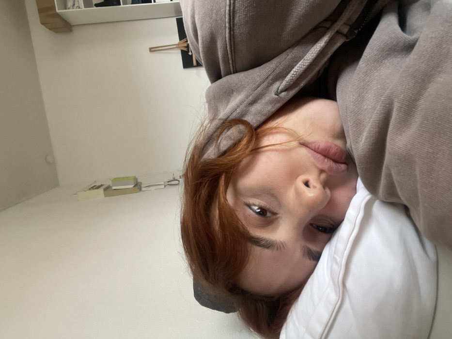 An adult female individual with reddish-brown hair is depicted in a close-up, horizontal orientation, resting on a white pillow. Her head is turned towards the viewer, and her eyes are open, looking directly at the camera. Her lips are slightly parted. She is wearing a light brown or grey hooded sweatshirt, with the hood pulled back and visible around her head. The background consists primarily of a plain white wall. To the upper right, a section of a white shelving unit or closet is visible, containing objects. Below this, a dark rectangular object, possibly a framed item, is mounted on the wall, with a light-colored wooden decorative piece resting on or above it. Further to the left on the wall, several small, light-colored rectangular objects are vertically mounted, with wires or cords hanging beneath them, ending in hooks. The environment appears to be an indoor room. The specific city location of Reims, France, cannot be identified from the visual evidence provided.