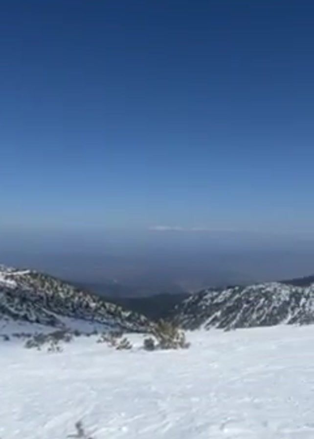snowy mountain landscape under a clear blue sky. Patches of snow cover the ground, with some sparse vegetation peeking through. In the distance, another mountain peak is visible, partially covered in snow and trees. The camera pans slightly, revealing more of the snow-covered terrain and a few small, scattered trees. The scene appears calm and serene.