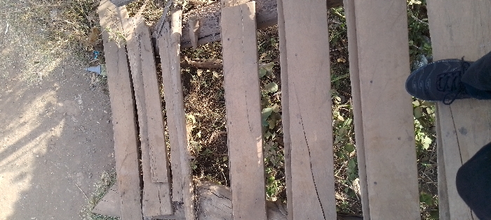 A low-angle shot of a makeshift wooden walkway or bridge