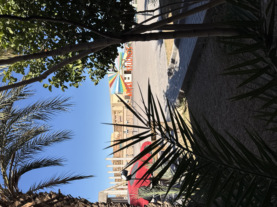 The image displays a sunlit outdoor scene at Atlas Studios in Ouarzazate, Morocco, under a clear blue sky. In the foreground, dark green palm fronds and the trunk of a large palm tree obscure the left side, while multiple slender tree trunks with green leaves occupy the right, casting shadows onto the sparse, dry ground. A paved walkway separates this vegetation from a large, unoccupied paved plaza in the midground. On the left side of the plaza, a partially covered red sports car is positioned next to a black studio light on a stand. Numerous small, dark, tripod-like stands are scattered across the plaza. The background features light brown, sand-colored architectural facades, resembling ancient or desert structures. Centrally located in the background is a building adorned with a vibrant, multi-colored sunburst or rainbow mural. The words "ATLAS STUDIOS" are visibly inscribed in orange lettering on the ground directly in front of this building. No individuals are present, and no human activity is depicted.