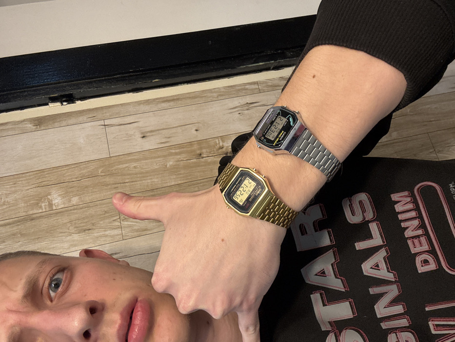 An individual is captured in an indoor setting, posing for a photograph. The upper left quadrant of the frame shows the left side of a person's face, featuring blue eyes, light skin, and short blonde hair. Their mouth is slightly agape. The subject's left arm is extended towards the camera, with the hand forming a "shaka" or "hang loose" gesture (thumb and pinky extended, middle fingers folded). Two digital watches are worn on the left wrist. The watch closer to the hand is gold-toned, featuring a digital display that reads "95 22 12" on the top line and "21:30 6" on the bottom line. The second watch, further up the arm, is silver-toned and branded "CASIO PAC-MAN." Its digital display shows "90 27 2" on the top line and "21:30 6" on the bottom line. The individual is wearing a black long-sleeved garment with "G-STAR ORIGINALS DENIM" printed in light grey on the chest. A portion of the individual's right arm, also in a black long-sleeved garment, is visible in the lower right. The background consists of light brown, vertically oriented wood-grain paneling. To the right of the frame, a dark, possibly black, vertical door frame or trim is present against a lighter, possibly white, wall. The specific location within the city of Novi Sad, Serbia, cannot be determined from the visual information provided in the image.