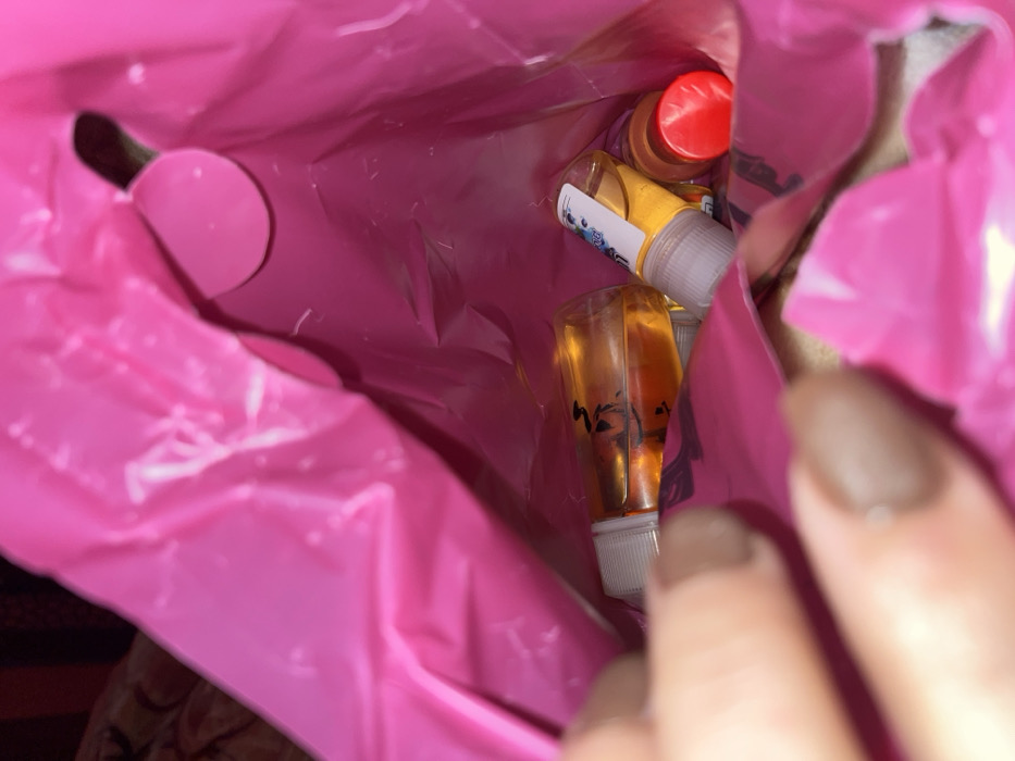 A pink plastic bag contains multiple small bottles. Several bottles hold a yellowish liquid. One bottle has a red cap, and another has a white cap with blue floral designs on its label. A hand with taupe nail polish is near the opening of the bag, possibly reaching inside.