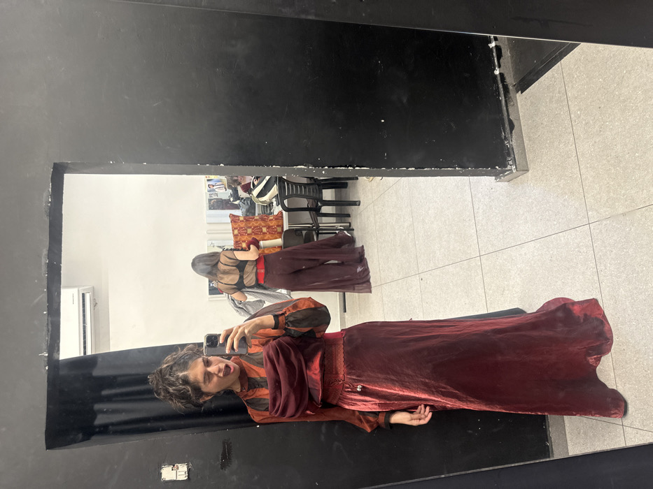 An interior scene captured as a mirror selfie depicts a young adult female, positioned centrally, holding a light-colored smartphone in her right hand to photograph her reflection. She has dark, curly hair styled upward and her mouth is open expressively. She is dressed in an ensemble featuring an orange and dark-striped long-sleeved top, a draped dark red garment covering her torso, a patterned dark red waist belt, and a flowing, floor-length dark red skirt. The mirror's reflection reveals a brightly lit room with white walls and a light gray tiled floor. A white air conditioning unit is visible on the upper wall. Reflected in the background is another female figure, her back largely to the viewer, wearing a sheer black top over a black bra, a bright red wide belt, and dark red wide-leg pants. She appears to be handling a light-colored fabric item while standing near a table with a large, multicolored patterned cushion. Two black plastic chairs are also visible in the reflection, along with several framed items on the wall, one of which reflects an individual in a suit. The mirror's frame and the surrounding wall are painted black, displaying some chips and wear at the lower edges. This scene takes place within an indoor commercial or private space in Tel Aviv, Israel. A more precise location within the city cannot be determined from the provided visual information.