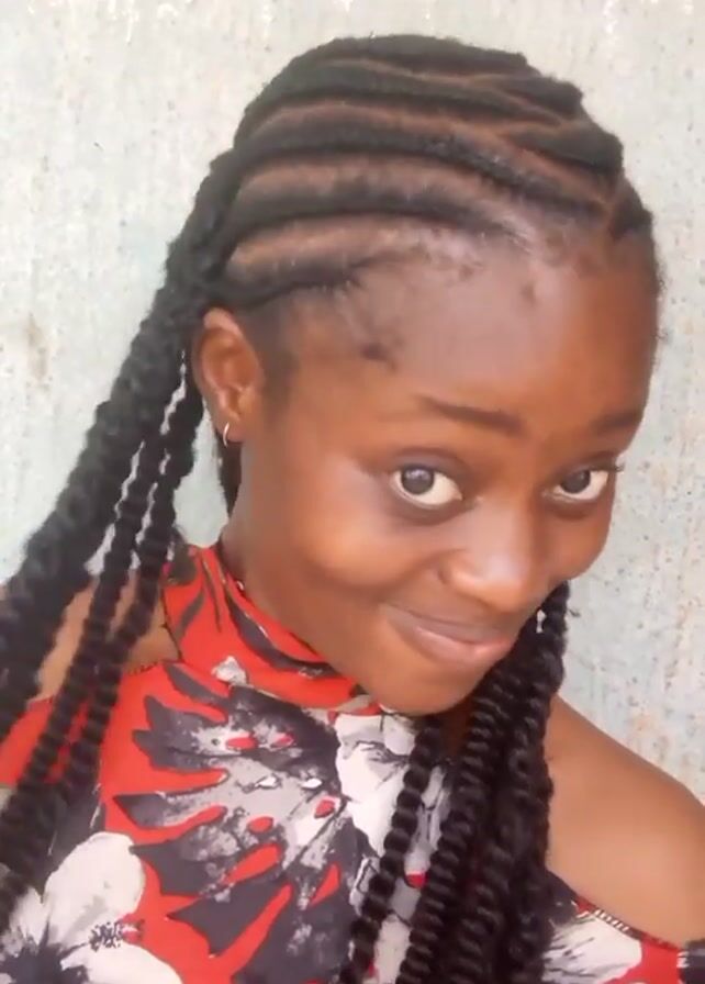 woman with dark skin and braids looking at the camera and smiling. Her hair is braided in straight lines towards the crown of her head, and the ends are styled into thick, twisted braids that hang down around her face. She is wearing a red, white, and black floral-patterned top that is cut off the shoulder. She looks down and up at the camera, revealing the pattern of her braids on top of her head. The background is a textured, light green wall.