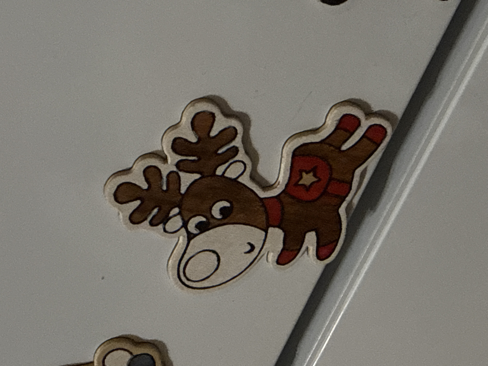 A close-up shot presents a wooden reindeer decoration adhered to a light gray surface, possibly a refrigerator door