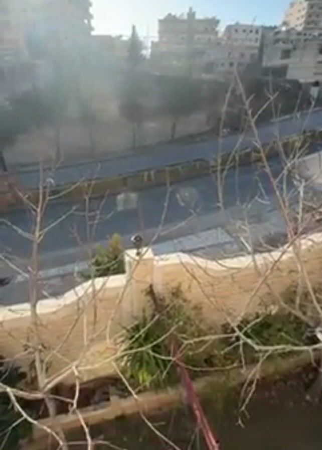 n outdoor scene during daylight. A view from an elevated position, possibly a balcony, looks over a garden area with bare trees. A brick or stone wall separates the garden from a street below. A swing is visible in the garden. In the background, there are buildings and structures suggesting an urban or suburban setting. The sun is shining, causing lens flare in the image. The video quality is fair, but the bright sunlight makes it difficult to discern finer details. No people are clearly visible. The camera appears stationary.