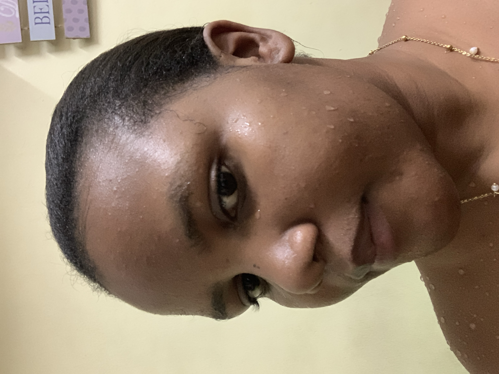 A close-up, angled portrait shows a dark-skinned person with water droplets on their face and upper body. A gold necklace with pearl accents is visible on their neck. The person has dark, close-cropped hair and appears to be looking downwards. The background is a pale yellow or cream color with a decorative object visible at the upper left. There is no information to suggest a specific location in Dar es-Salaam, Tanzania.