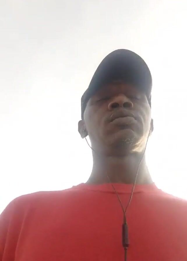 A person with dark skin, wearing a red t-shirt and a black baseball cap, is standing outside looking up at the camera. They have earphones on and their expression is neutral. The background is a bright, overcast sky. A few buildings, palm trees and a solar-powered street lamp are visible.