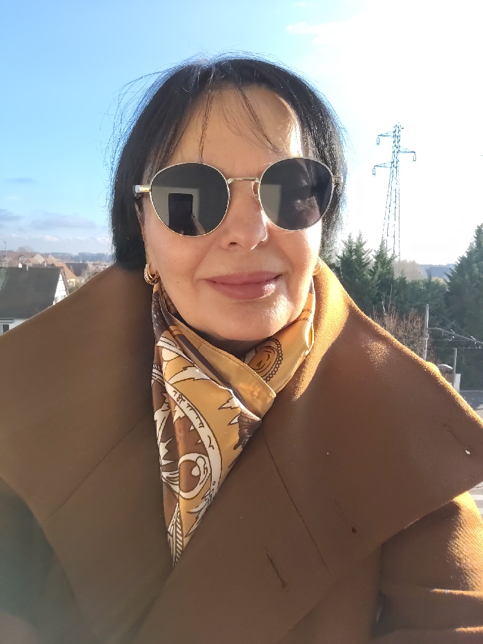 A female individual is depicted in a close-up outdoor portrait, facing the viewer with a slight smile. She has dark hair and wears gold-framed, dark-lensed sunglasses; the right lens reflects an interior room. Her attire includes a brown collared coat and a patterned silk scarf in tan, gold, and brown hues, featuring abstract motifs and a circular emblem. Gold-colored textured hoop earrings are visible. The background, under a clear blue sky, shows a residential area with tiled roofs to the left. To the right, evergreen trees, a prominent metallic electricity pylon, and faint horizontal wires are present. The scene is located in Ostwald, France.