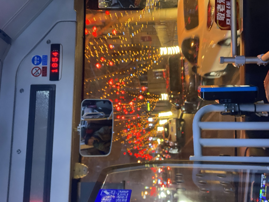 - "The image captures a nighttime view from the interior of a public transit bus, looking forward onto a city street in Linghe, China" by FM-7sf2h2, licensed under CC BY 4.0
