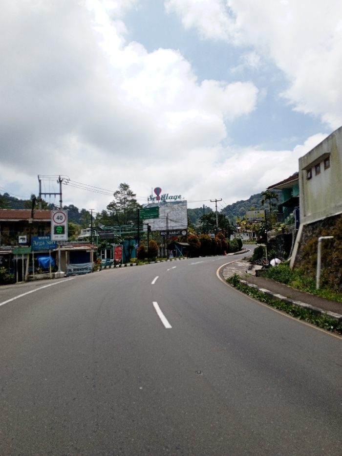 The image depicts a paved two-lane road curving to the right, under a partly cloudy sky, in what is identified as the city of Multhan, India. The road surface is dark asphalt with a white dashed center line and a solid white line marking the left edge in the foreground. No people or vehicles are visible on the road. On the left side of the road, a single-story building with a brown roof and light-colored walls houses a business identified by a sign reading "WISATA Arga Sari" in white text on a blue background. A circular speed limit sign displaying "40" in black on a white background with a red border is attached to a pole nearby. Utility poles and overhead power lines are visible above and behind the building, leading into dense green foliage. On the right side of the road, a light-colored, multi-story building with three small, rectangular windows is situated on an elevated, vegetated bank. A white pipe runs vertically up the bank's side. In the mid-ground, a large billboard prominently displays "Sevillage" in white text with a red hot air balloon logo, and a sign below it reads "KOPI KABUT." The background consists of lush green hills covered with dense trees and additional buildings, suggesting a mountainous or hilly environment.