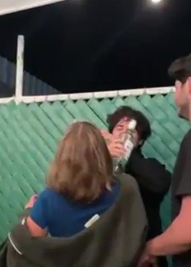 Here's a detailed description of the video: The video shows a group of people, mostly from the waist up, gathered outside under a white awning with exposed light bulbs. A light green fence serves as a backdrop. The focus shifts to a man with dark, curly hair who is holding a clear glass bottle filled with a green liquid. He's dressed in a black jacket. He drinks directly from the bottle, tilting it up as he does so. Beside him is another person with blonde hair, turned partially away, also holding a similar bottle. Other people are visible on either side. The overall scene conveys a casual, social gathering.