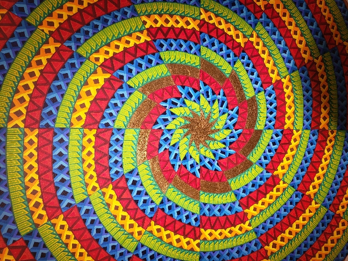 A vibrant, radial pattern dominates the scene, featuring concentric bands of geometric shapes. Triangles, diamonds, and x-shaped patterns repeat in blocks of red, blue, yellow, and green, creating a visual swirl. The center features a starburst design in metallic tones, surrounded by segments of brown and blue. The overall effect is a dynamic and colorful geometric composition with a focal point at the center.