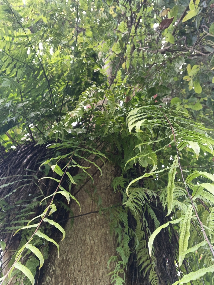 A tall tree trunk, textured and gray, is partially obscured by an abundance of vibrant green ferns and foliage