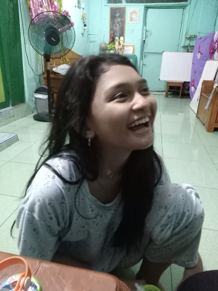 A young female, characterized by dark, shoulder-length hair, is captured mid-laugh, looking upwards and to the right, within a residence in Kecamatan Pati, Indonesia
