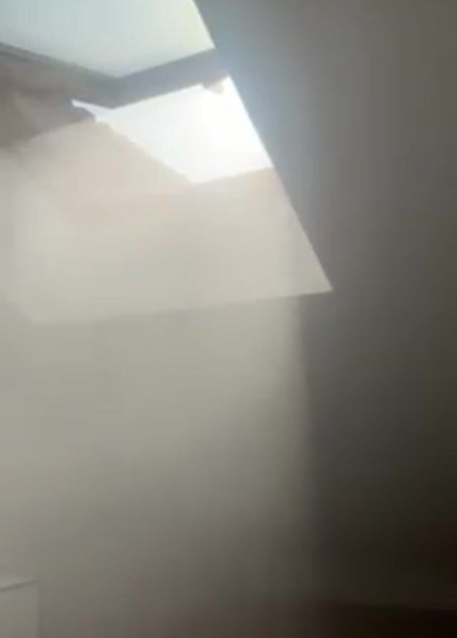 room with a skylight. A beam of light shines through the skylight, illuminating dust particles in the air. The light beam is very bright and creates a stark contrast with the shadowed areas of the room. A white cabinet or appliance is visible on the left. A wooden desk or cabinet is located against the right wall.
