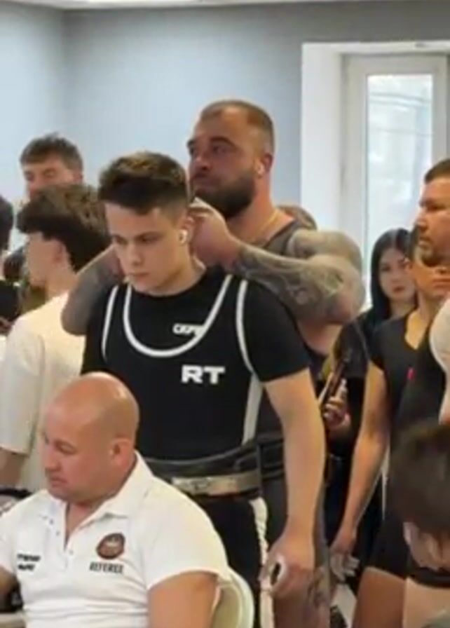 weightlifting event, with a young male competitor in a black and white singlet being assisted by a larger, tattooed man adjusting his singlet. A "REFEREE" is seated in the foreground, observing. Other people, including men and women, are standing around, some holding phones. The setting appears to be an indoor space with natural light coming from a window. The atmosphere seems to be focused and attentive to the upcoming competition.