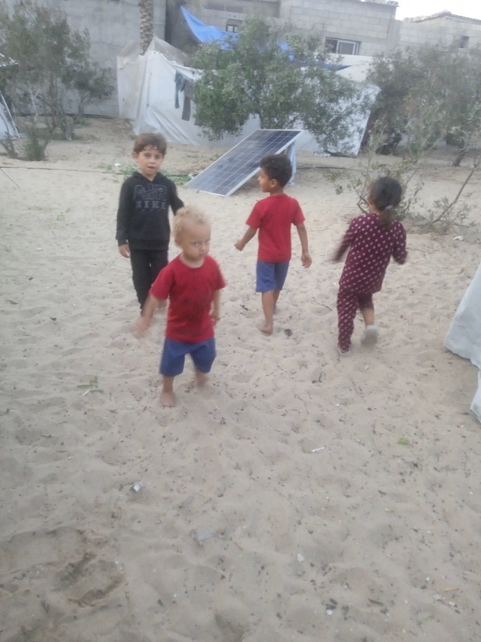 - "An outdoor scene in a sandy area within the city of Al-Mawasi depicts four children amidst makeshift shelters and sparse vegetation" by FM-cV3b62, licensed under CC BY 4.0