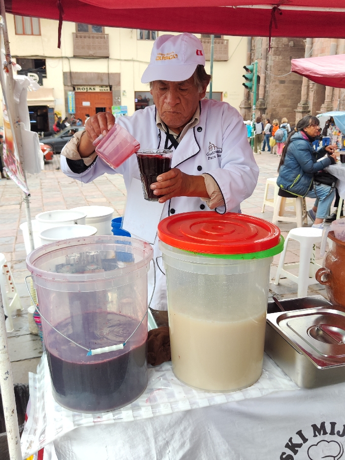 A street vendor operates under a red canopy in Wanchaq, Cusco, Peru. An older male individual, wearing a white chef's coat and a white baseball cap with "Cusco" text and a Peruvian flag logo, is observed pouring a reddish-pink liquid from a small clear plastic pitcher into a clear glass containing a dark purple liquid. He holds the pitcher in his right hand and the glass in his left. On the table in front of him, covered with a white cloth displaying a partial "SKI MIJ" logo and a chef's hat icon, are multiple containers. These include a large clear plastic bucket filled with a dark purple liquid, and an adjacent large clear plastic bucket with a red lid and green rim, containing a pale off-white liquid. Several white plastic bowls are stacked to the left. A stainless steel food pan and a brown ceramic pot are also visible on the table. The background reveals an urban setting. To the left, multi-story buildings with windows and balconies, one displaying "ROJAS H.R," line a street where a dark vehicle and pedestrians are present. To the right, a traffic light displaying a green signal is visible, alongside a large stone architectural structure. Further right, a person in a blue jacket is seated at a white table on a white stool. Other pedestrians are visible in the mid-ground.