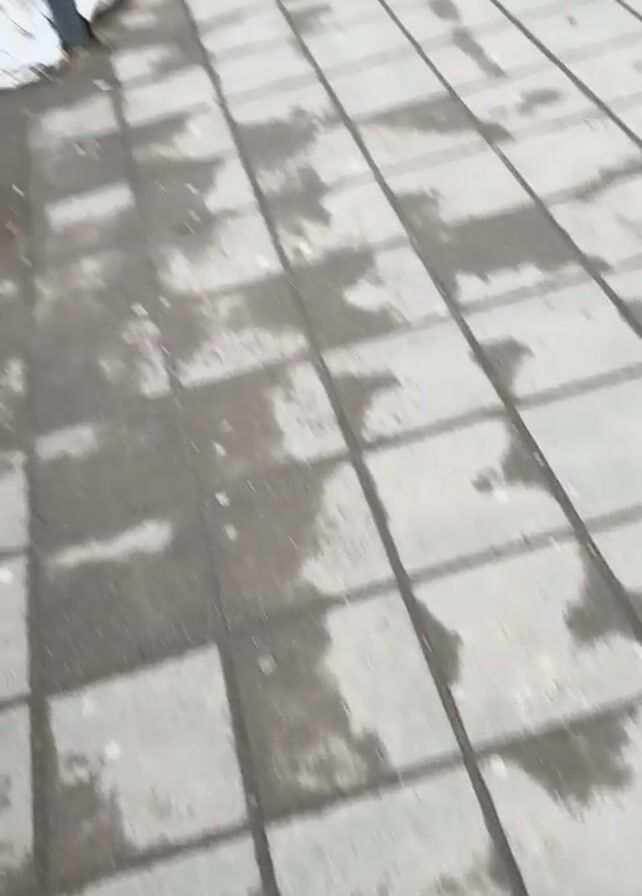 street scene on a cloudy day, filmed from a first-person perspective while walking on a sidewalk made of gray, square pavers