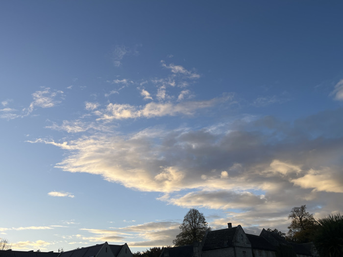 The image displays an external view dominated by a dynamic sky over the village of Newton St. Loe, United Kingdom. The upper two-thirds of the frame consists of a deep blue sky transitioning to lighter hues towards the horizon. Scattered cirrus-like clouds are visible in the upper sections, while the middle and lower sky are filled with stratified clouds exhibiting varying tones of grey, white, and golden-yellow, suggesting low-angle sunlight, likely during sunrise or sunset. The bottom third of the image reveals the upper portions of architectural structures and deciduous trees. Multiple dark-grey pitched rooftops of stone or slate construction are visible, indicating traditional buildings. Several trees, some appearing bare or with sparse foliage consistent with autumn, are interspersed among the structures and along the horizon. No individuals, direct actions, or interactions are present in the static scene.