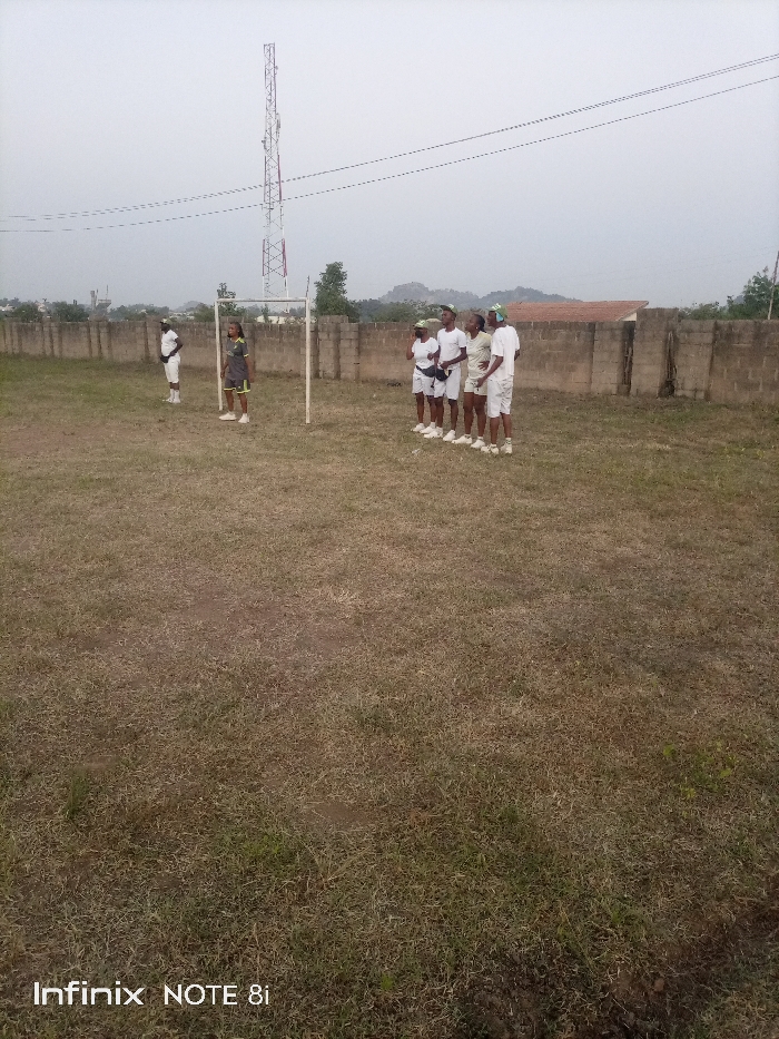 A group of seven people stand on a grassy field. Six are wearing white outfits, possibly uniforms, and stand in a line. One individual wears a darker outfit and stands a distance away near a goalpost. A tall communication tower is visible in the background, along with a wall bordering the field. The sky appears overcast. The scene suggests a training or practice session.