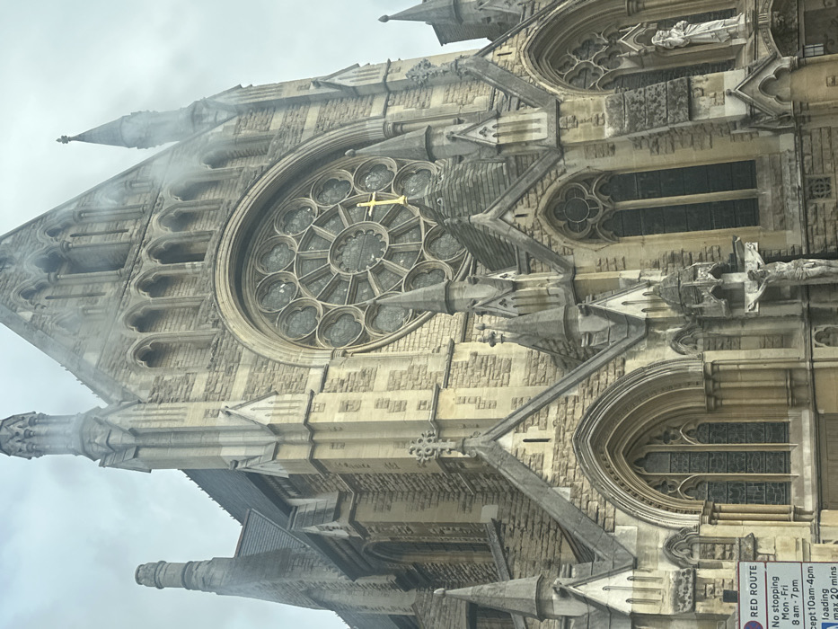 The image displays Our Lady of Victories Church, situated on Kensington High Street in London, United Kingdom, beneath an overcast sky. The prominent Gothic Revival structure is constructed from light-colored, rough-hewn stone. The church's facade features a large central rose window with intricate tracery. Below this, a golden cross surmounts a small dome-like structure. The building's upper sections incorporate multiple pinnacles and arched windows, some containing dark stained-glass panels. Sections of the roof, visible behind the facade, are covered in dark slate. At the lower left of the facade, an arched entrance is present. To the right of this entrance, a stone sculpture of Jesus on a crucifix is affixed to the wall. Further right, a white statue of a robed figure stands within an ornate niche. In the lower-left foreground, a partial view of a red 'RED ROUTE' traffic sign is visible. The sign displays text indicating "No stopping Mon - Fri 7 am - 7 pm" and a loading exemption "except 10 am - 4 pm loading max 20 mins." The image itself exhibits slight hazing, consistent with being captured through a window.
