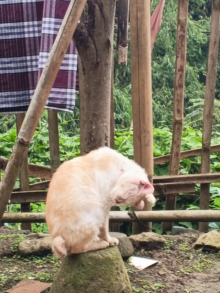 - "An orange and white cat perched atop a moss-covered stone, head bowed low in apparent grooming" by FM-lI7Km1, licensed under CC BY 4.0