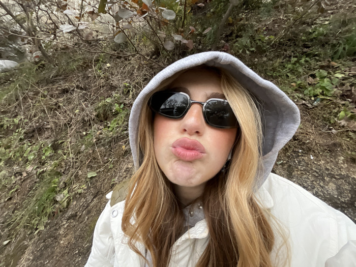 A single individual is depicted in a close-up, selfie-style photograph taken outdoors in Huairou District, China. The subject, a person with long, light-colored hair, is positioned centrally, facing the camera with their head slightly tilted and lips pursed in a "duck face" expression. They wear dark, rectangular-framed sunglasses, a light grey hooded garment with the hood pulled over their head, and a white outer jacket. The background consists of a sloping natural incline featuring dry brown vegetation, sparse green plants, and bare tree branches, indicative of an uncultivated, possibly wooded or scrubland environment.