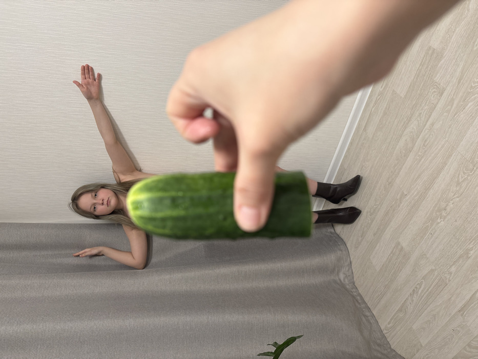 A woman poses in an odd position, apparently on a gray curtain with her head toward the left, right arm up, and legs in brown boots toward the top right. A large cucumber is held in front of her by a hand, creating the illusion that the cucumber is her torso. The background includes a white ceiling and a light wooden floor. There's a small green plant in the bottom center.