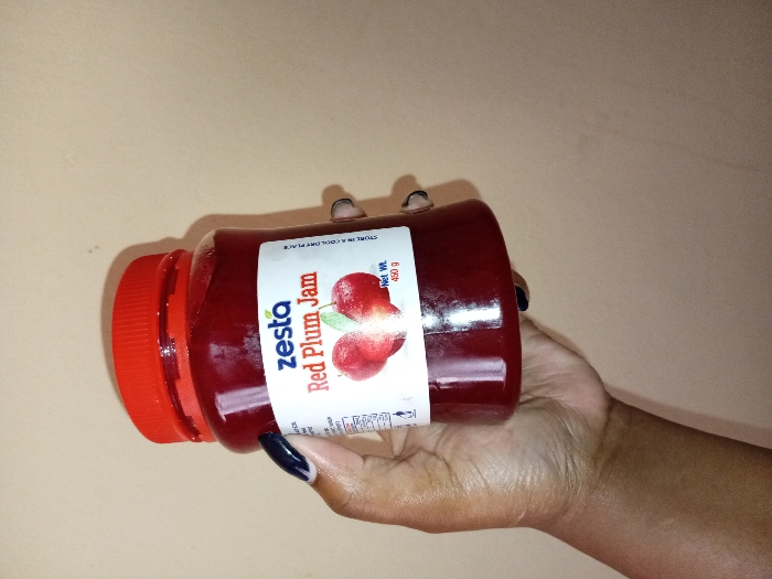 - "A dark-skinned human left hand, with dark blue nail polish on the visible thumb and pinky fingernails, securely grasps a transparent plastic jar of Zesta Red Plum Jam" by FM-FCCQg2, licensed under CC BY 4.0