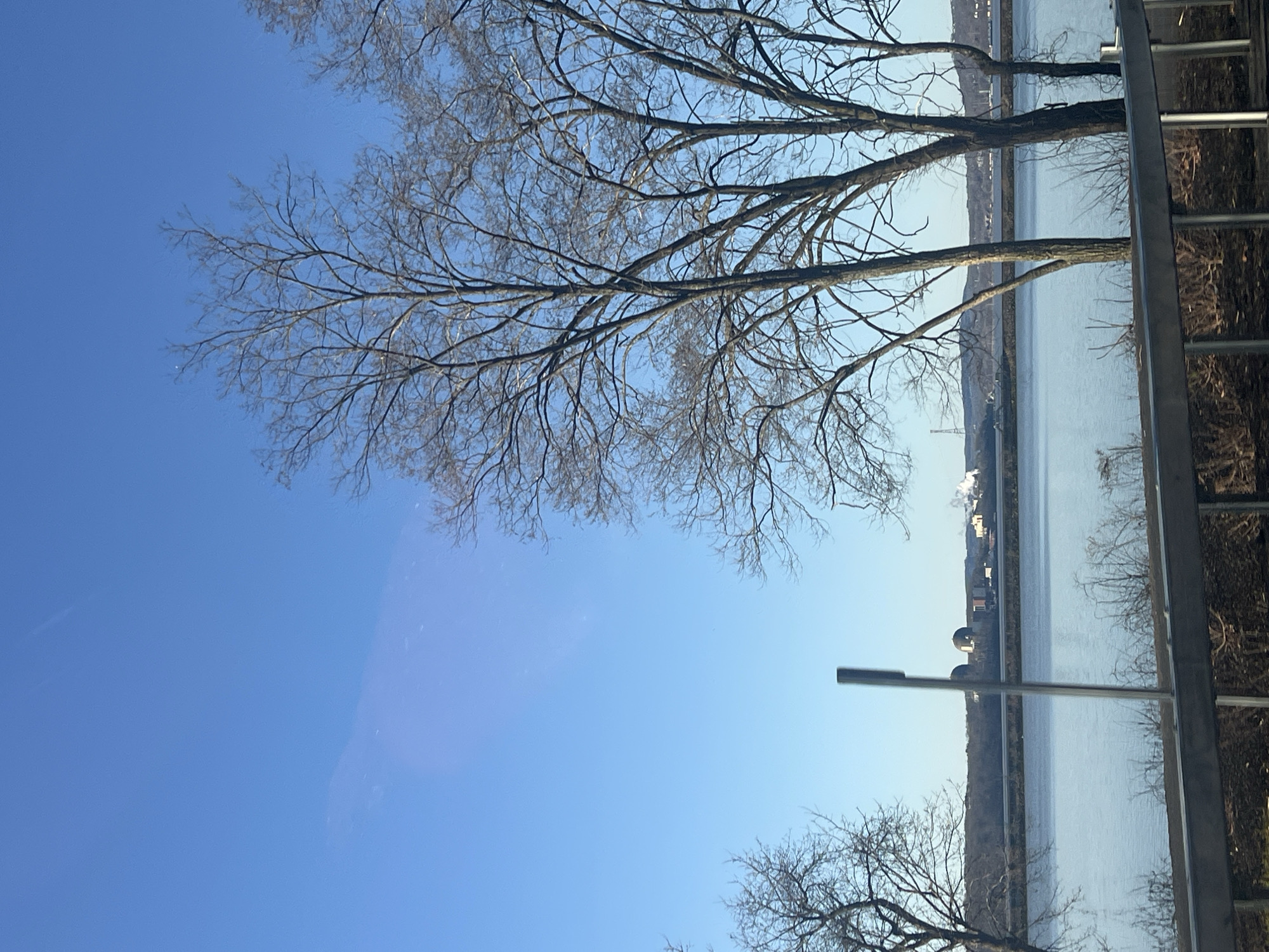 The image displays a clear blue sky over a wide body of water, likely the Hudson River, viewed from a slightly elevated position in the Town of Cortlandt, United States of America. In the foreground, a metal guardrail runs horizontally across the bottom, with a thin, dark vertical signpost positioned just left of center. Several tall, bare deciduous trees with dark, intricate branches frame the scene, primarily on the right and extending into the top left. The water is calm, reflecting the bright sky. On the distant bank, across the water, two prominent dark grey, dome-shaped structures, indicative of a power plant (likely Indian Point), are visible. To their right, white plumes of steam or smoke rise from industrial buildings, with a tall lattice tower further right on a distant hill. The far bank is lined with dormant vegetation and low hills under the clear sky. There are no people visible.