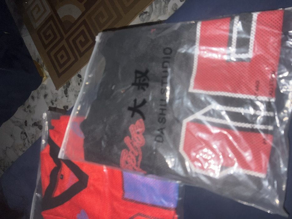 two packaged garments with prominent red colors and other accenting colors. One package displays large red and black geometric shapes with the inscription "DA SHUI STUDIO" and what appears to be Chinese characters. The second packaged item also features red, with purple elements visible. The clothing seems to be made of a mesh-like material. The background reveals parts of a rug and a surface, possibly a bed or sofa, of a dark blue color.