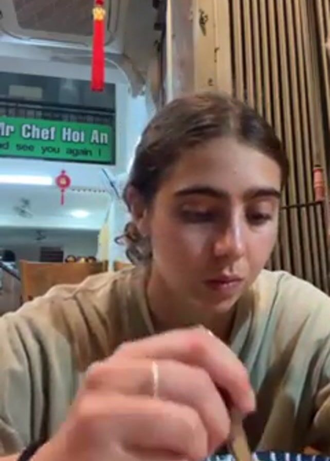 A woman is shown in the frame from the chest up, eating food with a spoon from a bowl with a blue-patterned rim. She holds the spoon close to her face and looks directly into the camera. The setting appears to be an outdoor food establishment, with a green sign visible in the background that reads "Mr Chef Hoi An see you again!" A red decorative hanging ornament and a commercial air conditioning unit are also present. The woman has dark hair pulled back and is wearing a light brown t-shirt. Vertical metallic bars are visible behind her on the right side of the frame.