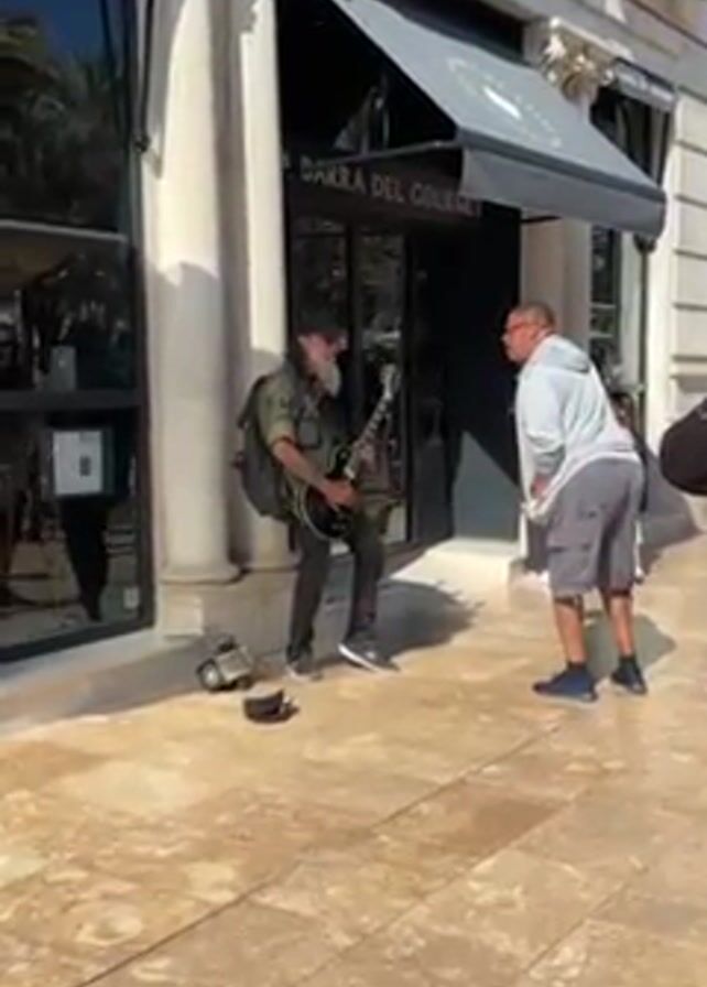 A street performer plays an electric guitar on a sidewalk in front of a store named "La Barra Del Gourmet". He has a long beard, wears a black hat, a camo jacket, black pants and grey sneakers. He has a backpack on and a small amplifier on wheels next to him. He is standing in front of a man in a light grey hoodie, khaki shorts and blue sneakers, who appears to be speaking or singing along to the music. Other people are passing by in the background. The sidewalk is paved with orange stones.