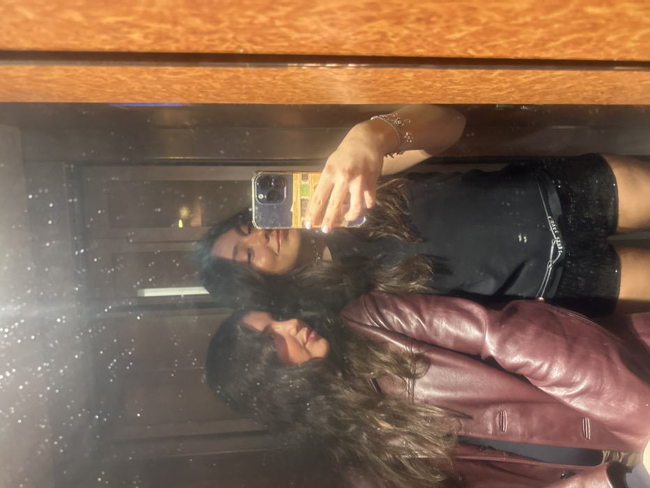 A woman is shown in a selfie reflecting in a mirror. The reflection is of the same woman wearing a maroon jacket, and it's positioned below the real woman who is wearing a black shirt, shiny black shorts and has on a silver bracelet. She is holding her phone up to take the picture with the phone's back facing the mirror. The mirror appears slightly dirty.